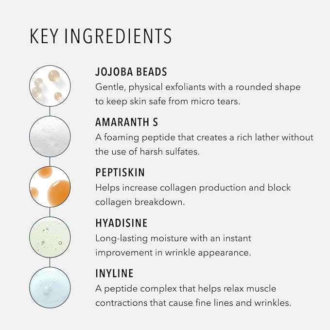 - Healthy Cell Renewal: Gentle physical exfoliation combined with collagen-boosting a& wrinkle relaxing peptides promotes cell renewal, inproves radiance while diminishing fine lines & wrinkles