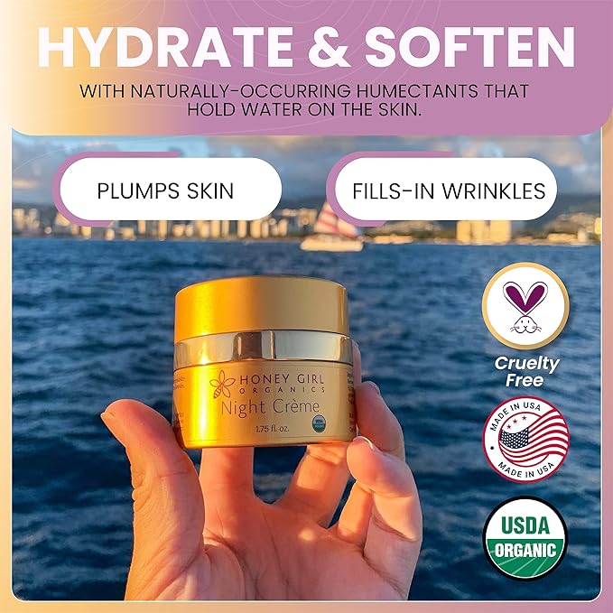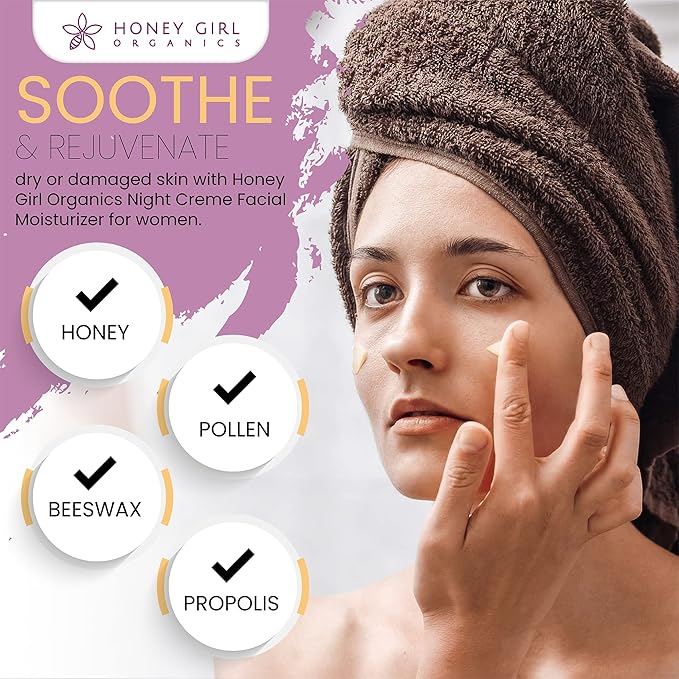 - SOOTHE AND REJUVENATE dry or damaged skin with Honey Girl Organics Night Creme. Nutrient-rich organic honey* and organic beeswax* stimulate skin repair as you sleep. *naturally contains pollen, propolis & royal jelly