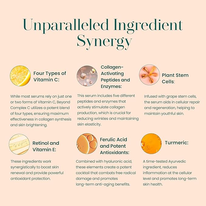 - ๐ Why Choose Beyond Complex C?: Hylunia's serum goes beyond the ordinary by incorporating four types of Vitamin C, collagen-activating peptides, and plant stem cells for a holistic skincare experience. In contrast, most serums use only one or two types of Vitamin C, limiting their effectiveness. Beyond Complex C's high-potency antioxidants and retinol deliver comprehensive benefits, ensuring your skin receives the ultimate care and rejuvenation it deserves.