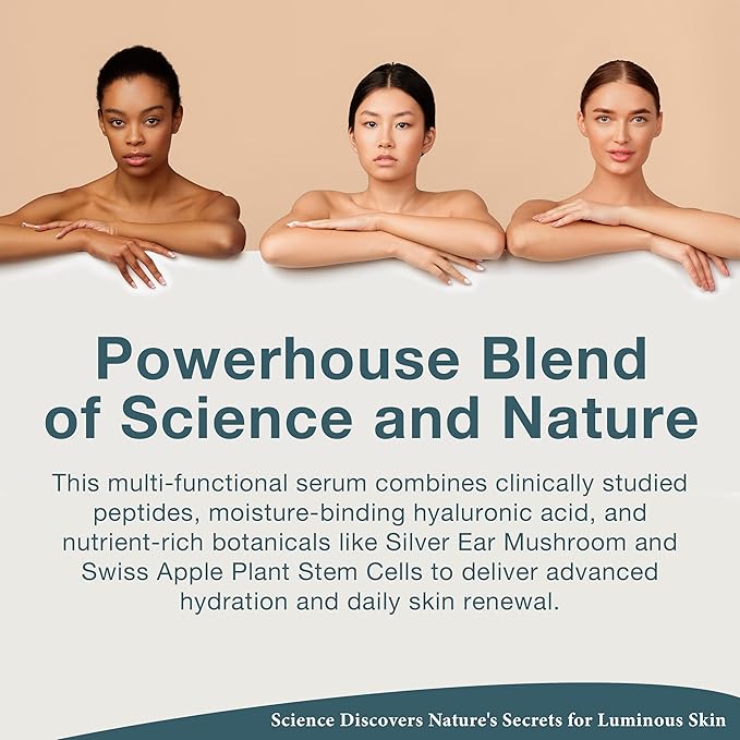 - HYDRATING SERUM WITH ADVANCED PEPTIDE COMPLEX – Delivers deep hydration through hyaluronic acid, silver ear mushroom, and colloidal minerals in a gentle formula designed to renew skin, restore moisture balance, and support daily facial skincare routines.