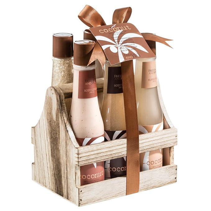- BEAUTIFULLY PRESENTED - This tropical coconut bath and body spa gift set in this natural wood liquor caddy is a unique gift which will easily blend in to your kitchen, bathroom, or conference room decor.