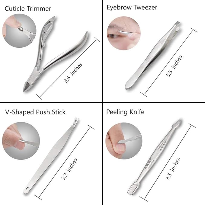 - 12PCS MANICURE KIT: Includes toenail clipper, nail clipper, diagonal nail clipper, multi-purpose scissor, cuticle trimmer, ear pick, single-edged double-sided push stick, eyebrow tweezer, peeling knife, nail file, blackhead needle and loop remover, V-shaped push Stick.