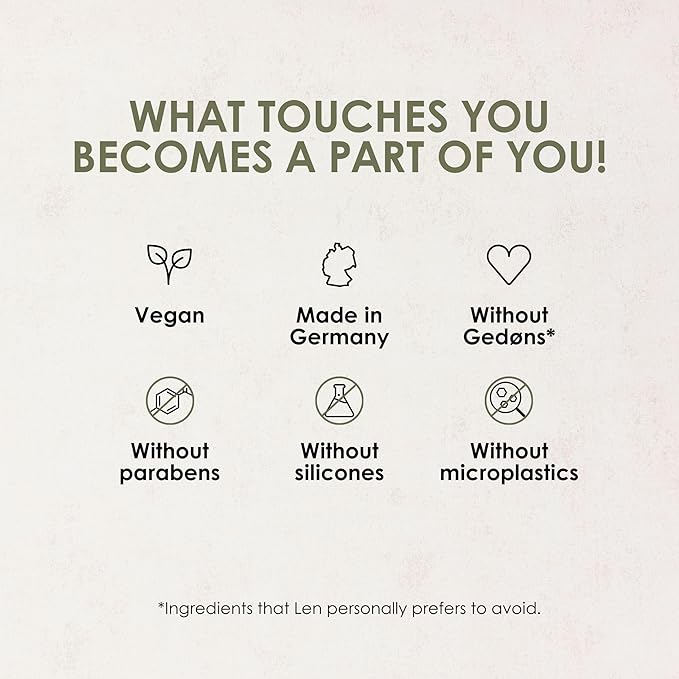 - WITHOUT GEDØNS*: For us, Gedøns* are things and especially ingredients, that our founder Len wants to avoid in our products. These include parabens, silicones and animal ingredients. We do not claim that these ingredients are harmful or bad. We simply don't want certain substances in our products because we know many of you don't want them either.