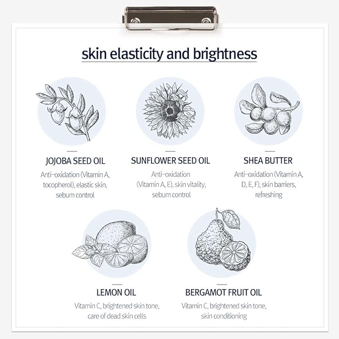 - SKIN ELASTICITY AND ALLEVIATED: Strong antioxidant ingredients such as Jojoba seed oil, Sunflower seed oil, Shea butter, Lemon oil and Bergamot fruit oil, having plenty vitamins and minerals, improve skin elasticity and brightness. Various herb oil, Rosemary leaf, Lavender oil and Geranium oil, transforming irritated skin into alleviated and healthy skin.