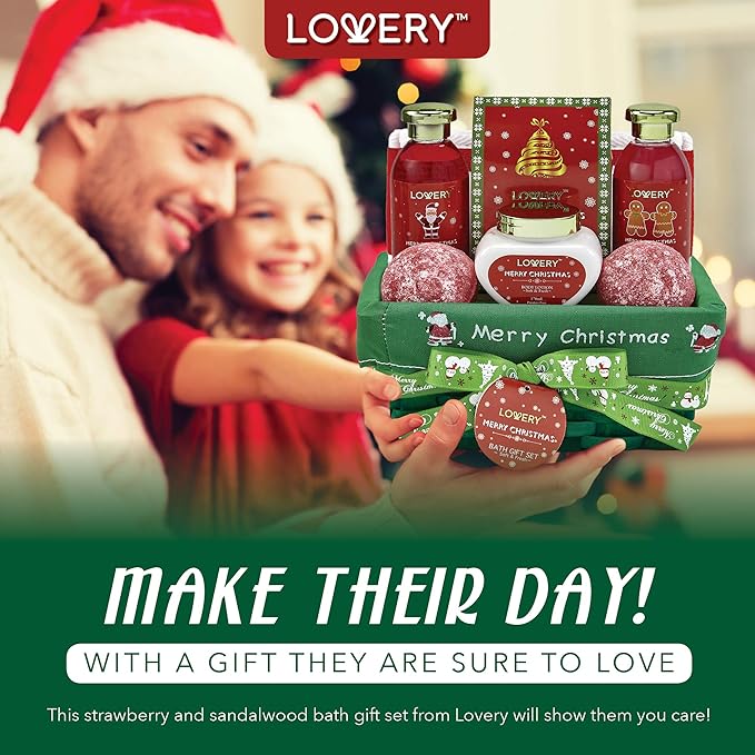 Bath and Body Christmas Gift Basket ForWomen–Strawberry & Sandalwood Fragrance-Holiday Home SpaSet, Includes Merry Christmas Body Lotion, 2 OversizedBath Bombs, Bath Salt, Weaved Basket & More