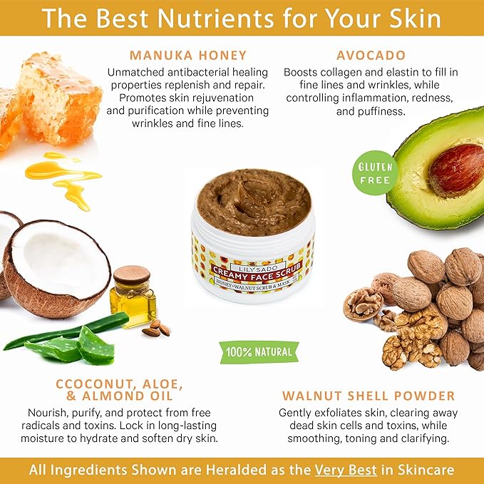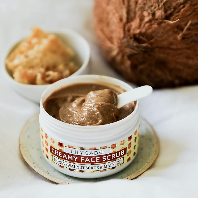LILY SADO HONEY WALNUT Creamy Face Scrub - Best Exfoliating Facial Cleanser for Women & Men - Gently Exfoliates, Softens & Energizes Skin, Treats Acne, Reduces Pore Size - For All Skin Types - 4 oz
