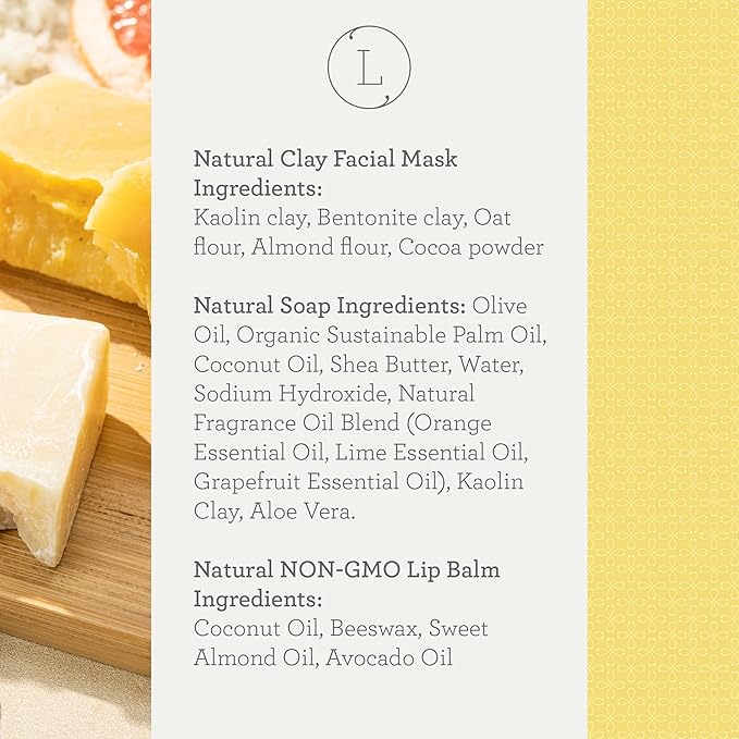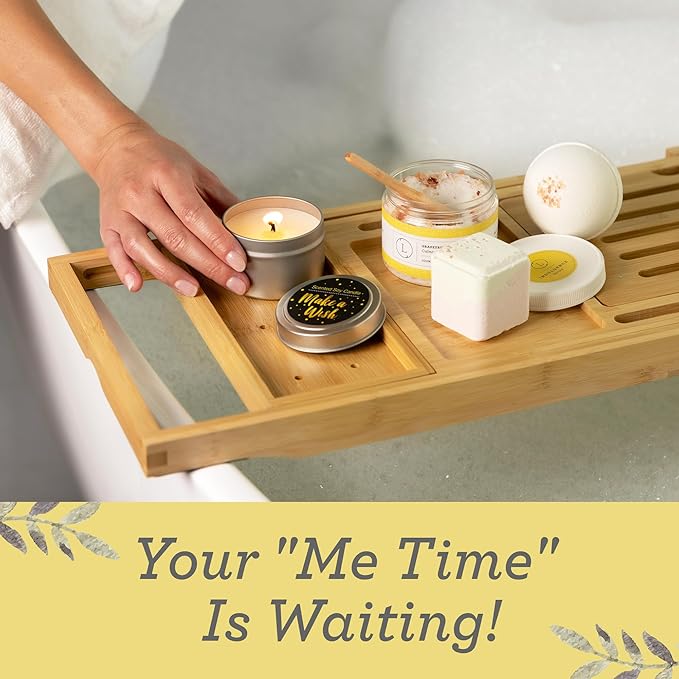 - SPA DAY KIT FOR WOMEN: Relax with this citrus bath set and gift box for women, which includes a citrus soap bar, a grapefruit soap bar, body scrub, shower mist, a clay mask, lip balm, a “Make a Wish” soy candle, a soap saver pouch, and a makeup bag.