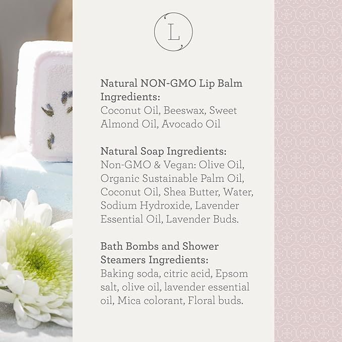- INCLUDES: All-natural bath set includes: ❀ Lavender natural soap bar ❀ Clay facial mask ❀ Natural lip balm ❀ Eye mask ❀ Soap saver ❀ Shower steamer ❀ Gorgeous box (5''x5''x3'')