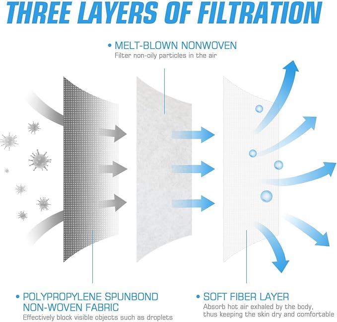 - 3-Layers of Non-Woven Fiber Fabric to Provide Fine Filtration and Maximum Breath-ability