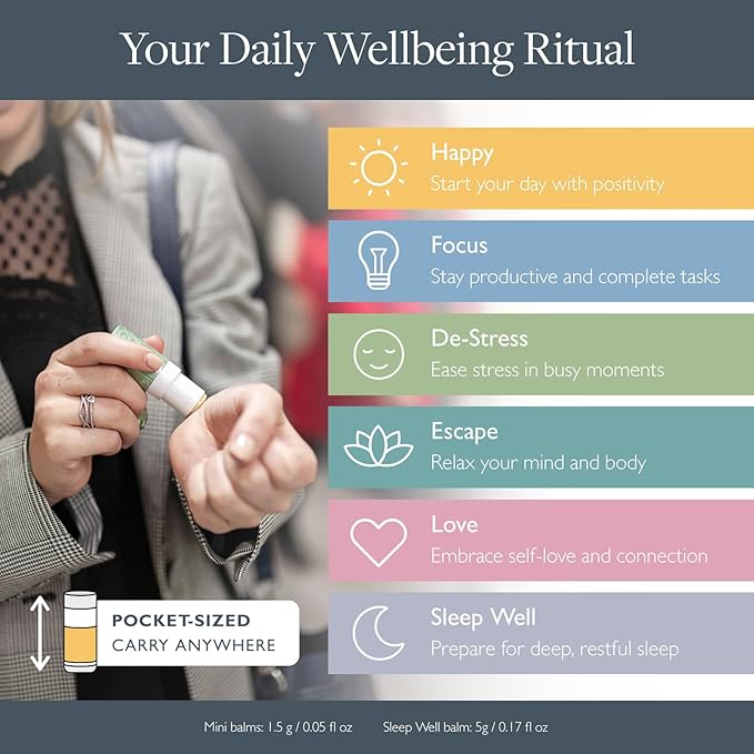 - Your Aromatherapy Daily Wellness Ritual – The Daily Ritual Gift Set includes 6x expertly crafted aromatherapy balms to support your emotional well-being throughout the day. Featuring a full-size 5g Sleep Well Balm and 5x mini balms (De-Stress, Focus, Love, Happy, and Escape) in a reusable travel pouch made from recycled plastic bottles, this relaxation pack is perfect for building mindful moments and routine wellness into your daily life.