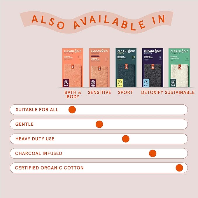 Cleanlogic Body Exfoliating Cloth, Stretchy Exfoliator Bath and Shower Washcloths for Smooth and Softer Skin, Reusable Daily Skincare Tool, Assorted Colors, 3 Count Value Pack