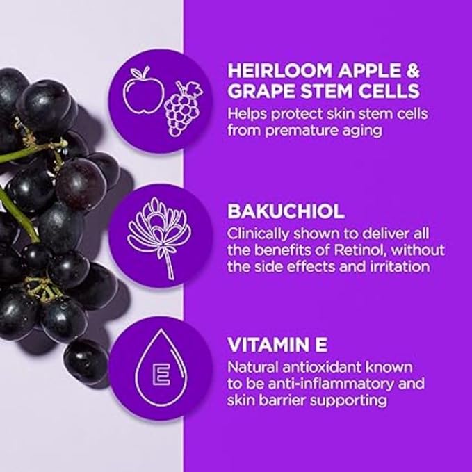 - Highly concentrated fruit stem cell complex and super antioxidants, boost dermal vitality as Bakuchiol, a natural plant-based alternative to retinol, reduces the appearance of fine lines and wrinkles and improves skin texture and tone for a firmer, youthful appearance and rejuvenated complexion