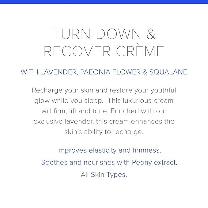 - Turn Down and Recover Crème: The Turn Down and Recover Crème will redefine your take on beauty sleep . Designed to recharge skin, it improves elasticity and firmness, while you sleep. Awaken with a youthful glow and ample skin. Great for all skin types.