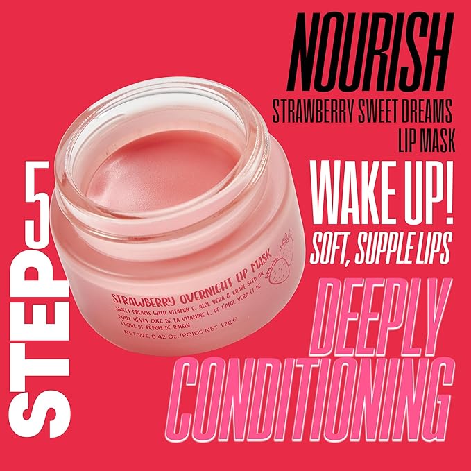 - STEP 5: NOURISH – Strawberry Sweet Dreams Lip Mask – Wake up to SOFT, SUPPLE LIPS with this deeply conditioning overnight lip treatment.