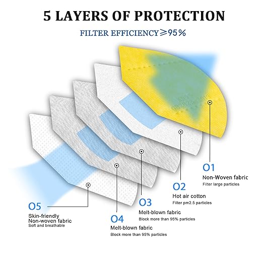 akgk KN95 Face Mask 50 PCS, Breathable Protection Masks, 5-Ply KN95 Yellow Masks, Cup Dust Safety Masks