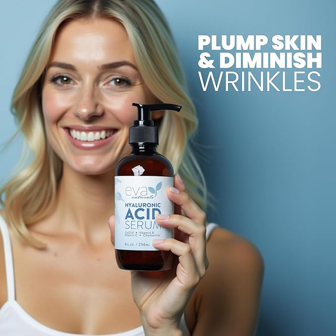 - DEEPLY HYDRATE & MOISTURIZE - Dullness and dry patches draining your skin of it’s natural radiance? The Eva Naturals hyaluronic acid skin-smoothing formula is not only highly effective for wrinkle and dark spot reduction, but it also allows for deeply penetrating hydration and moisture to the skin pores. With the ability of hyaluronic acid to hold more than 1000 x’s it’s water weight, your skin is able to retain it’s natural moisture for all-day dewiness and hydration.
