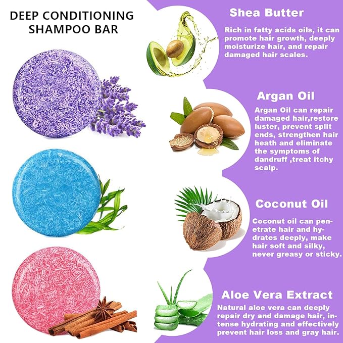 - Natural Shampoo Bar For Hair :Natural shampoo bar cleans and conditions your hair with moisturizing olive oils and shea butter. They leave all hair, even dry, processed locks, looking glossy, shiny, and soft. Plants essential oil works to dry damaged hair