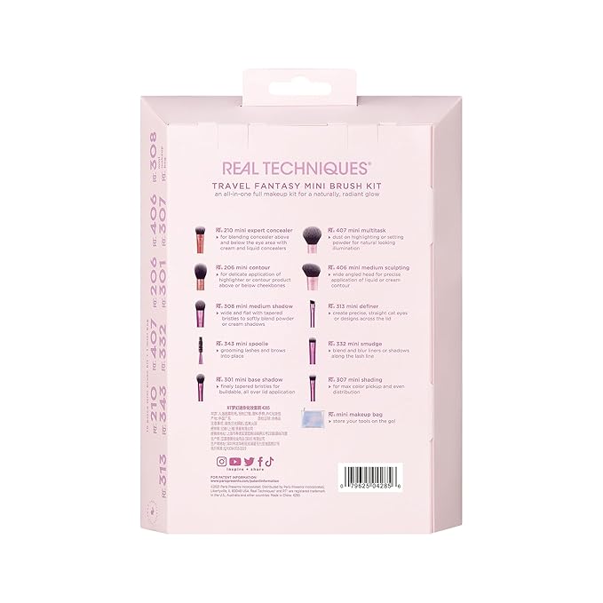 - Real Techniques Travel Fantasy Mini Brush Set includes: Expert Concealer Brush, Multitask Brush, Contour Brush, Medium Sculpting Brush, Medium Shadow Brush, Definer Brush, Spoolie, Smudge Brush, Base Shadow Brush, Shading Brush, & Makeup Bag