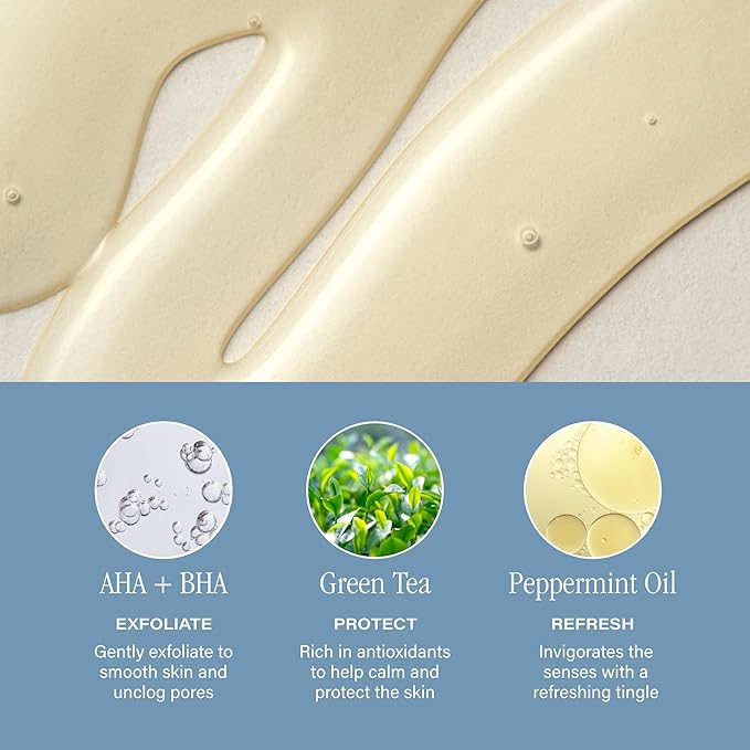 - Your Daily Morning Skin Reset – Gently exfoliate and remove water-based impurities, including dirt and grime, with this refreshing and invigorating blend of green tea and mint cleanser.