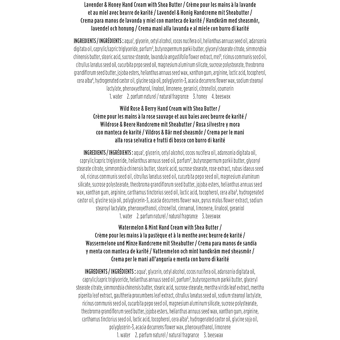 - THREE DELIGHTFUL SCENTS: Hand cream set includes three gorgeous fragrances—Lavender and Honey, Wild Rose and Berry, and Watermelon and Mint—to indulge the sense while softening rough, dry hands
