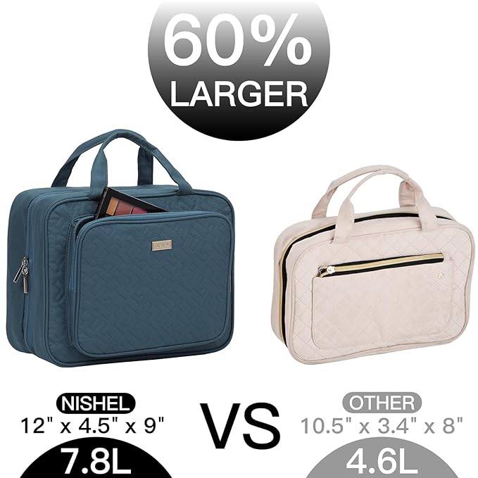 NISHEL Travel Toiletry Bag for Women Large Capacity, Makeup Essentials Organizer, Hanging Case for Accessories, Cosmetics, Lake-Blue