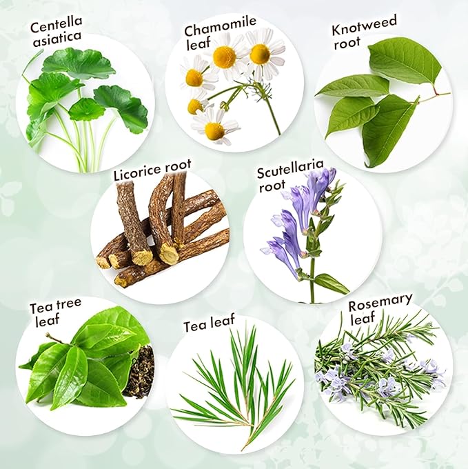 - ✅A luxurious combination of 8 types of natural plant-based skin conditioners Glycyrrhiza Glabra (Licorice) Root Extract Scutellaria Baicalensis Root Extract Centella Asiatica Extract Rosmarinus Officinalis (Rosemary) Leaf Extract Melaleuca Alternifolia (Tea Tree) Leaf Extract Chamomilla Recutita (Matricaria) Leaf Extract Camellia Sinensis Leaf Extract Polygonum Cuspidatum Root Extract *Skin conditioning ingredient