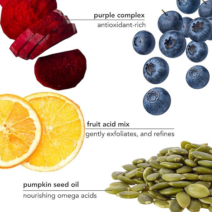 - KEY INGREDIENT 2: Fruit Acid Mix (bilberry, orange & lemon, sugar maple, sugarcane) : gently exfoliates and refines while hydrating skin to reveal visibly brighter, smoother and more even-toned skin.