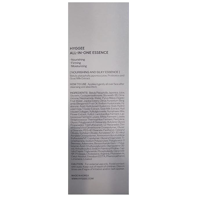 - CALMING & SOOTHING INGREDIENTS: Hyggee All-in-One Essence is formulated using refreshing and nourishing ingredients like Probiotics to strengthen the skin barrier, Aqua Ceramide to retain moisture, Birch Sap to prevent dryness & flakiness, and Goat Milk Extracts to help manage vigorous and firm skin.