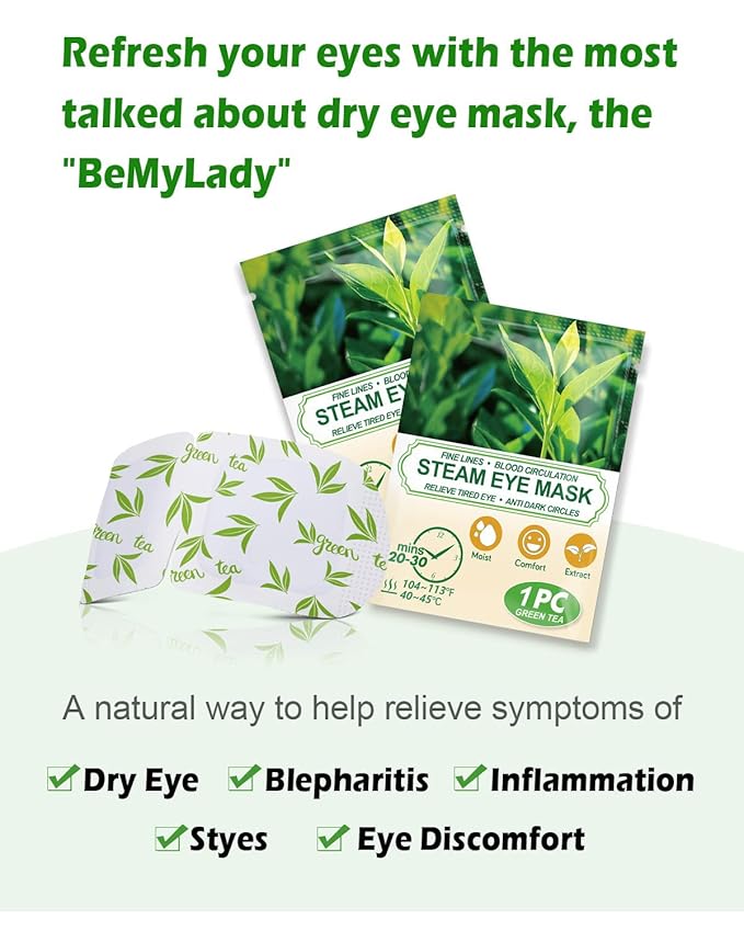 - ๐ใGreen Tea Self Heated Eye Mask ใOur steam eye masks can relieve your eye fatigue,moisturize your eyes,improve your sleep quality,reduce dry puffy eyes and dark circles.This self warming heated eye mask will promote your blood circulation, release fine moist steam, comfort the skin around eyes, let tired eye enjoy the steam, fully relieve dry eyes and eye astringent with just 30-minute eye spa.