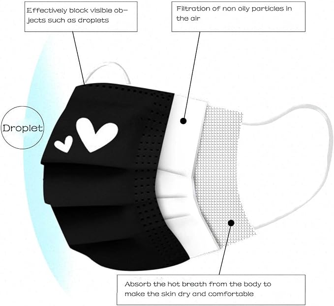 50pcs Cute Disposable Face Masks, Pink And Black Masks with Hearts Printed, 3-Ply Full Face Protection for Women Teen Girls