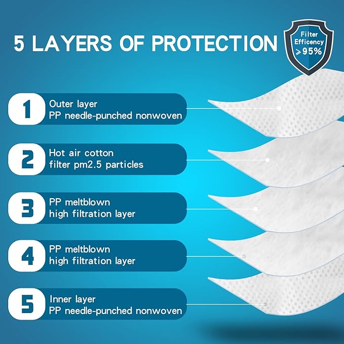 - FILTER MEDIA - This N95 Masks has four filter layers, PP spunbond outer layer, PP needle-punched nonwoven inner layer 19 g, PP meltblown high filtration layer, PP spunbond layer, PP meltblown high filtration layer have double layer thickening filter media.