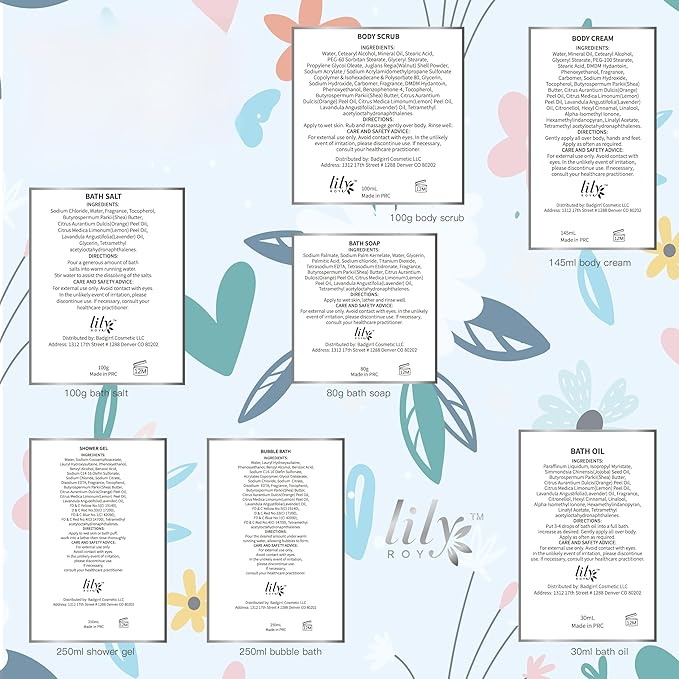 - Essential Oils: Lily Roy's Bath Sets contain premium quality and Sulfate & Paraben Free, Cruelty-Free Shower Essentials that are rich in Vitamin E, Shea Butter, and Essential Oil to help moisturize and soothe the skin