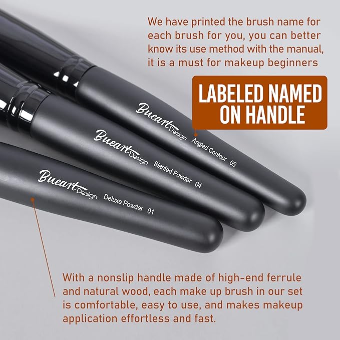 Bueart Design 19Pcs ULTRA SOFT Black labeled DENSE HAIR Makeup Brushes set Contains large powder Flat Foundation Ultimate Blending Make up Brush set Blush Face Brush Concealers contour Eyeshadow