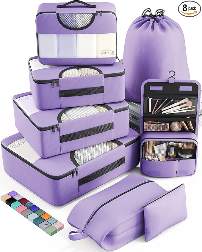 Veken 8 Set Packing Cubes for Travel Essentials, Suitcase Organizer Bags in 4 Sizes, Carry-On Luggage Accessories with Large Laundry & Hanging Toiletry Bag, Must-Have for Airplane, Road Trip & Camping