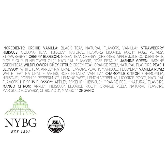 - TEA BAG ASSORTMENT with 10 flavors, 1 of each, Including: Orchid Vanilla, Ginger Lemon, Cherry Blossom, Wildflower Honey Citrus, Peach Blossom, Vanilla Rose, Jasmine Green, Chamomile Citron, Hibiscus Blossom, Mango Citron.