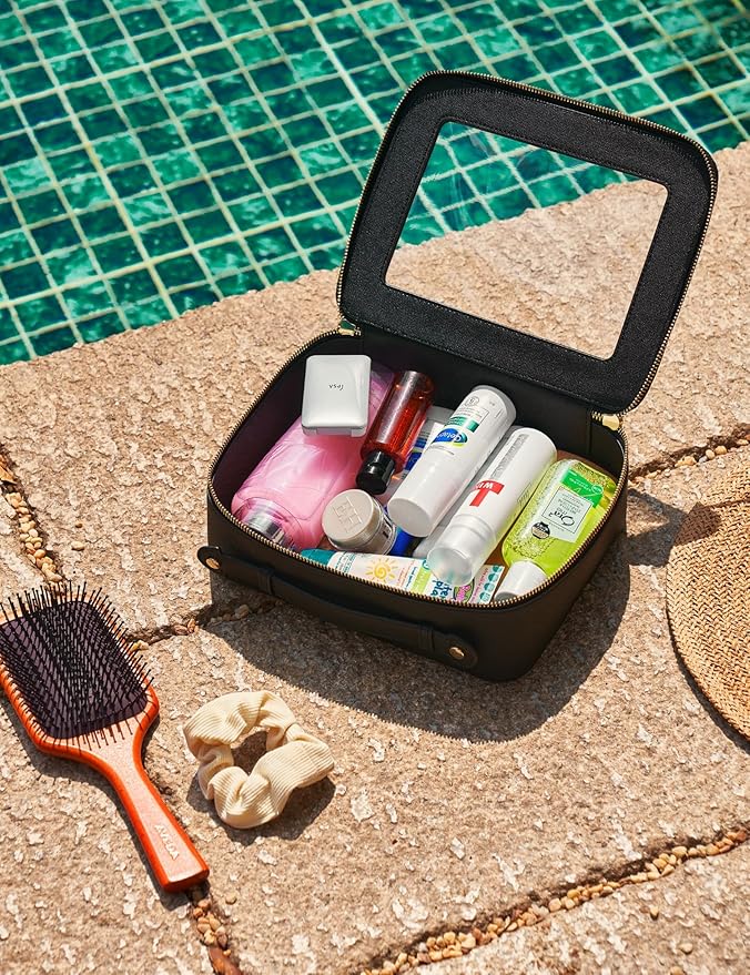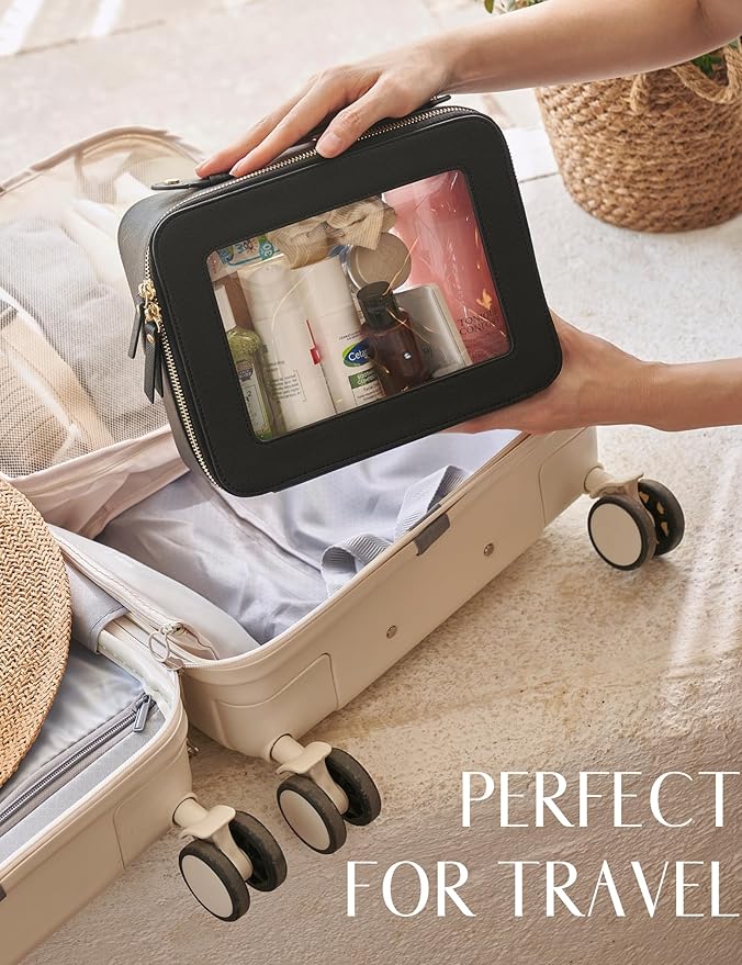 - [Spacious and Roomy] – The black travel make up bag measures 9.6'' x 7.5'' x 3.1'' (24.5cm x 19cm x 8cm), ideal for extended trips or situations where you need to carry a comprehensive collection of makeup and skincare products. It is designed to fit comfortably in suitcases and big travel bags.