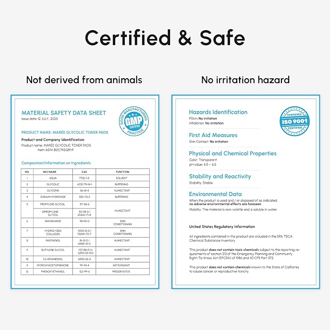 - We are Here for You - We use sustainable components and proven formulations. Use our MAREE Glycolic Acid Clearing Pads to enjoy the smooth skin you deserve. If you are unhappy with our acne pads for face, please contact us, and we will handle it.