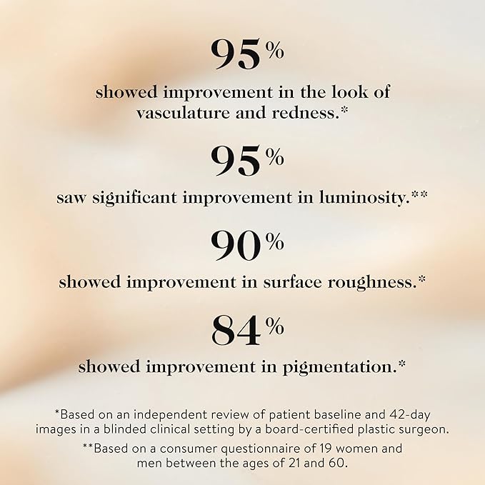 - Clinical Results: After six weeks of use:* 95% demonstrated improvement in dehydration, 95% demonstrated improvement in the look of vasculature and redness, and 90% demonstrated improvement in surface roughness.