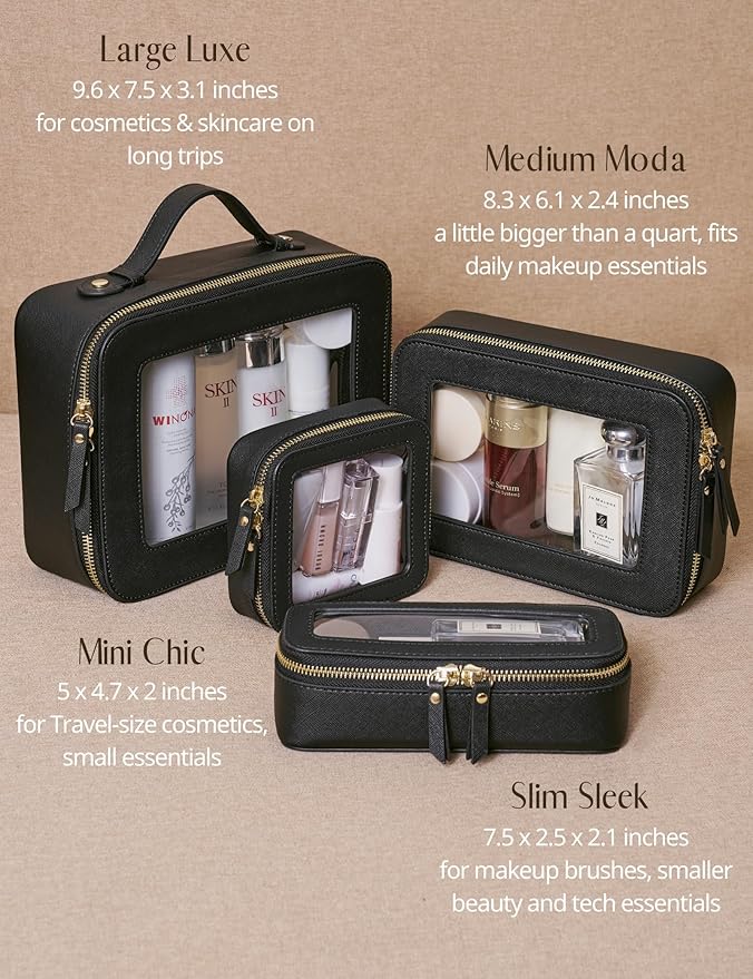 - [Premium Material and Durability] – The clear small cosmetic case, both the exterior and interior, is crafted from high-grade saffiano faux leather, which is highly scratch resistant, durable and exceptionally easy to keep clean. It features a smooth zipper for secure closure, and elegant light gold metal hardware accents, adding a luxurious and sophisticated touch to the bag's overall design.