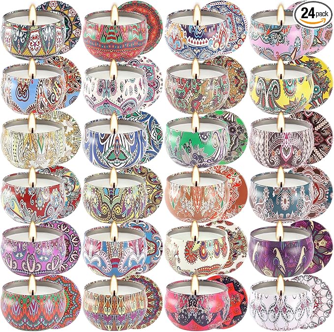 - Home Scented Candles: Made of natural soy wax, 2.5 ounces per jar, size: 2.5" x 1.5" per jar, 24 pack scented candles in a set with a total burn time of about 240 to 320 hours, with the effect of anxiety, soothing the body, etc.