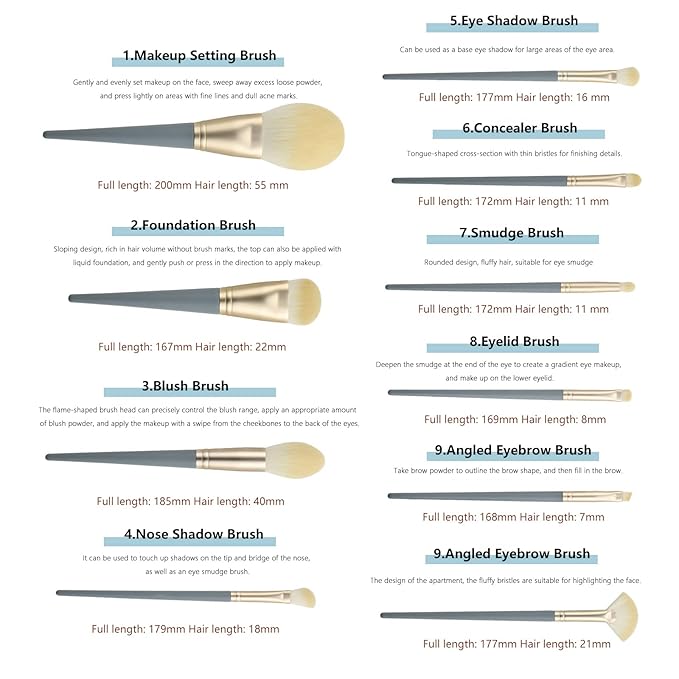 - MAKEUP BRUSHES SET - This 10 pcs makeup brush set includes a powder brush, a foundation brush, a concealer brush, a highlighter brush, a blush/contour brush, a lip brush, an eyebrow brush, an eyeliner brush, an angled brush, and an eyeshadow brush.