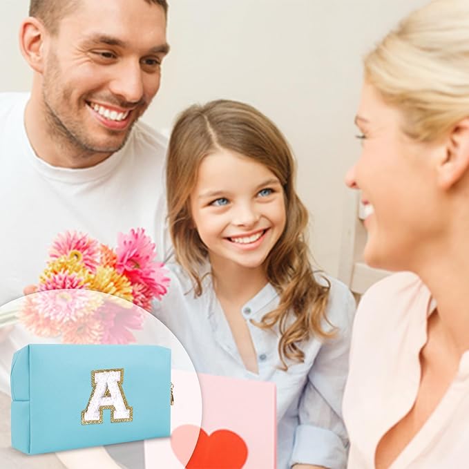 Small Personalized Initial A-Z Preppy Patch Makeup Bag,PU Chenille Letter Travel Cosmetic Pouch with Zipper,Blue Cute Toiletry Bag,Gift Ideal for Teen Girls Women Teacher Bridesmaid,Letter A
