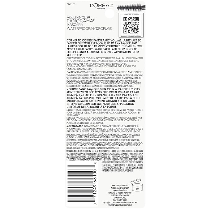 L'Oreal Paris Voluminous Panorama Mascara, Volumizing and Lengthening Mascara, Waterproof Longwear and Smudge Resistant Make Up, Black, 0.33 Fl Oz