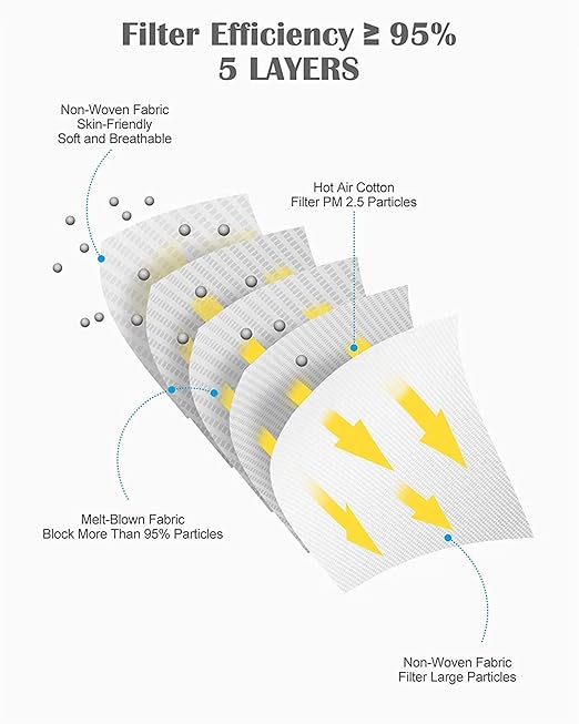 - Perfect 5 layered cup dust masks for shopping, public transport, bus terminals, shopping malls, parks and busy city streets. The inner skin-friendly layer absorbs moisture from the breath. And the 5-ply face mask allows for easy, simple, and healthy breathing at all times.