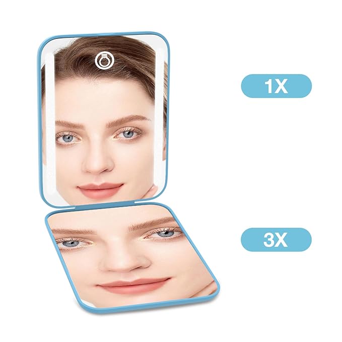 Kintion Rechargeable Pocket Mirror, Double Sided 1X/3X Magnification Compact Vanity Mirror, 3 Color Lights, Dimmable, Small Portable Wallet Mirror, Lighted Travel Mirror for Women Gifts, Blue