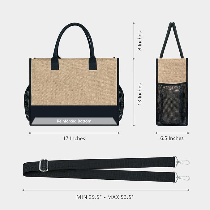 • ELABORATED CRAFT: Made of heavy duty singed (reduce fluff) natural jute, the tear strength is increased by 30%, which makes it stand up without tipping. All seams are reinforced by double thread sewing, 7 stitches per inch for the durability. It features zip-top closure for security. A removable thickened PE pad at bottom helps keep the bag in structured shape and won't sag even when it's loaded with many items.