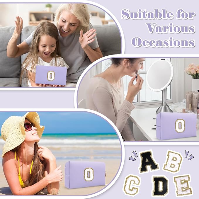 Personalized Makeup Bag Initial A-Z Preppy Patch Bag,Small PU Leather Travel Cosmetic Bag Pouch with Zipper,Purple Cute Toiletry Bag,Gift Ideal for Teen Girls Women Birthday Friend Mom,Latter O