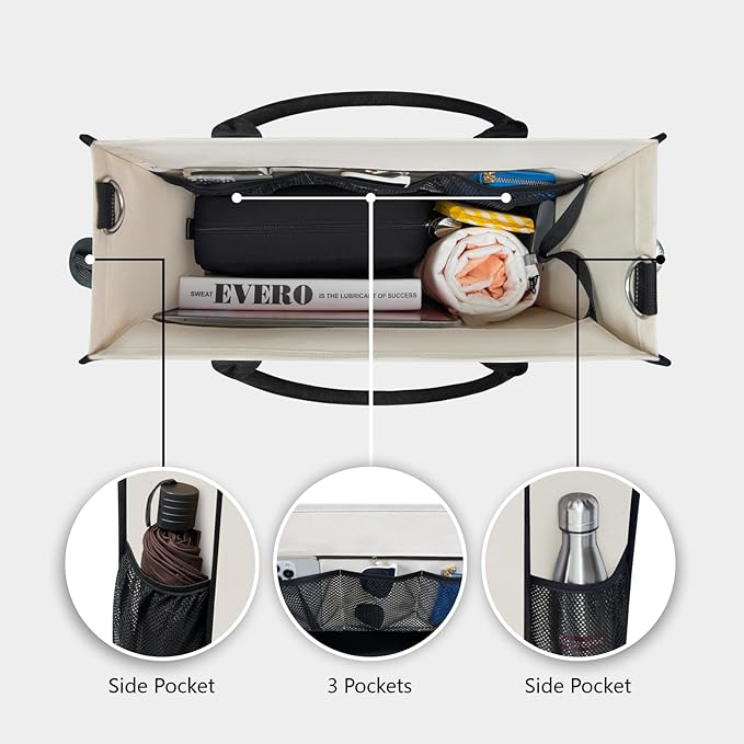 - EXCLUSIVE DESIGN: The large tote measuring 17" x 13" x 6.5" for your laptop, iPad, files. 3 divided open pockets inside for small items like cellphone, power bank, wallet, glasses. 2 side pockets for keys, water bottle, umbrella. Comes with an extra makeup bag (10 x 5.5 x 3.5 inches) for your cosmetics like suncream. This set offers plenty of storage space to keep your stuff organized exactly where it needs to be.