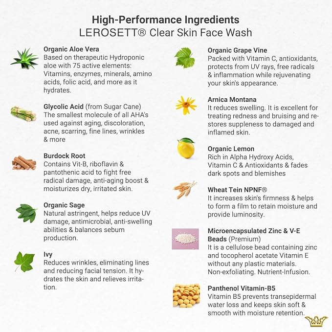 LEROSETTยฎ Clear Skin Face Wash โ Gentle Gel Cleanser with 60% Aloe-Rich Botanicals, 4% Glycolic Acid & Vit-E Microbeads โ Fights Breakouts, Unclogs Pores, Balances Oil โ Spa-Grade, Vegan โ 6.7oz