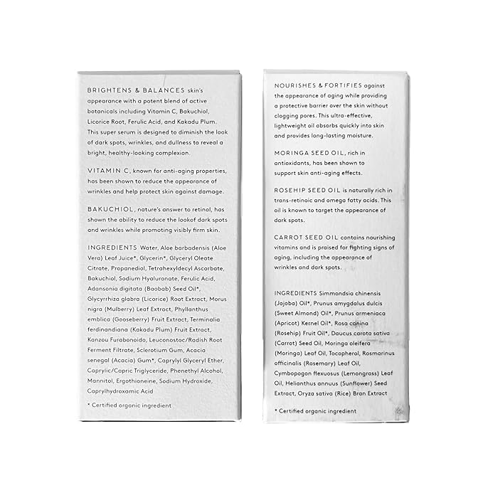 - KEY INGREDIENTS: Potent botanicals known for visible results: Bakuchiol for a radiant look and firm feel, Vitamin C for an even tone, Argan Oil for a youthful glow, and Pomegranate Seed Oil for deep nourishment.